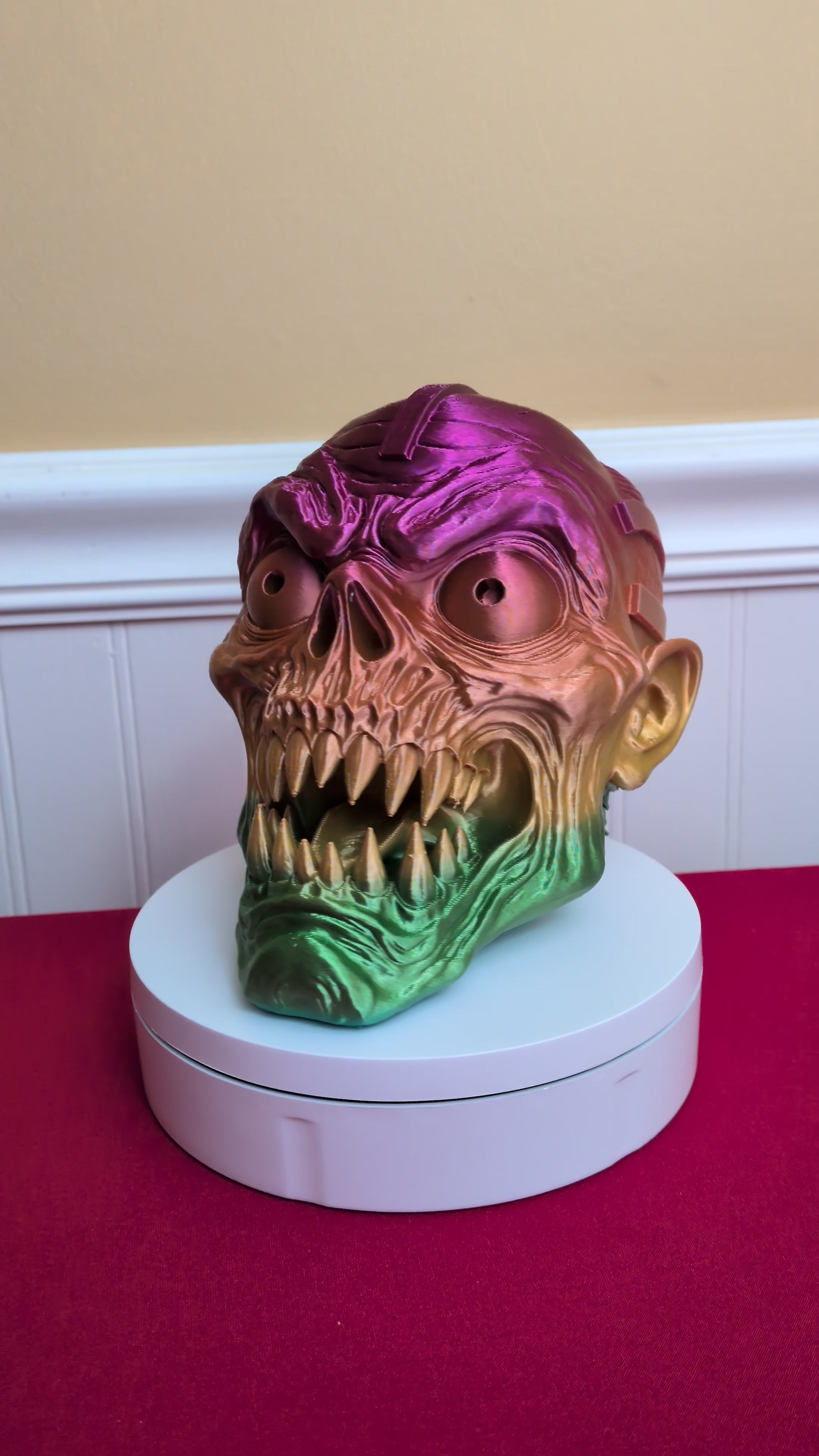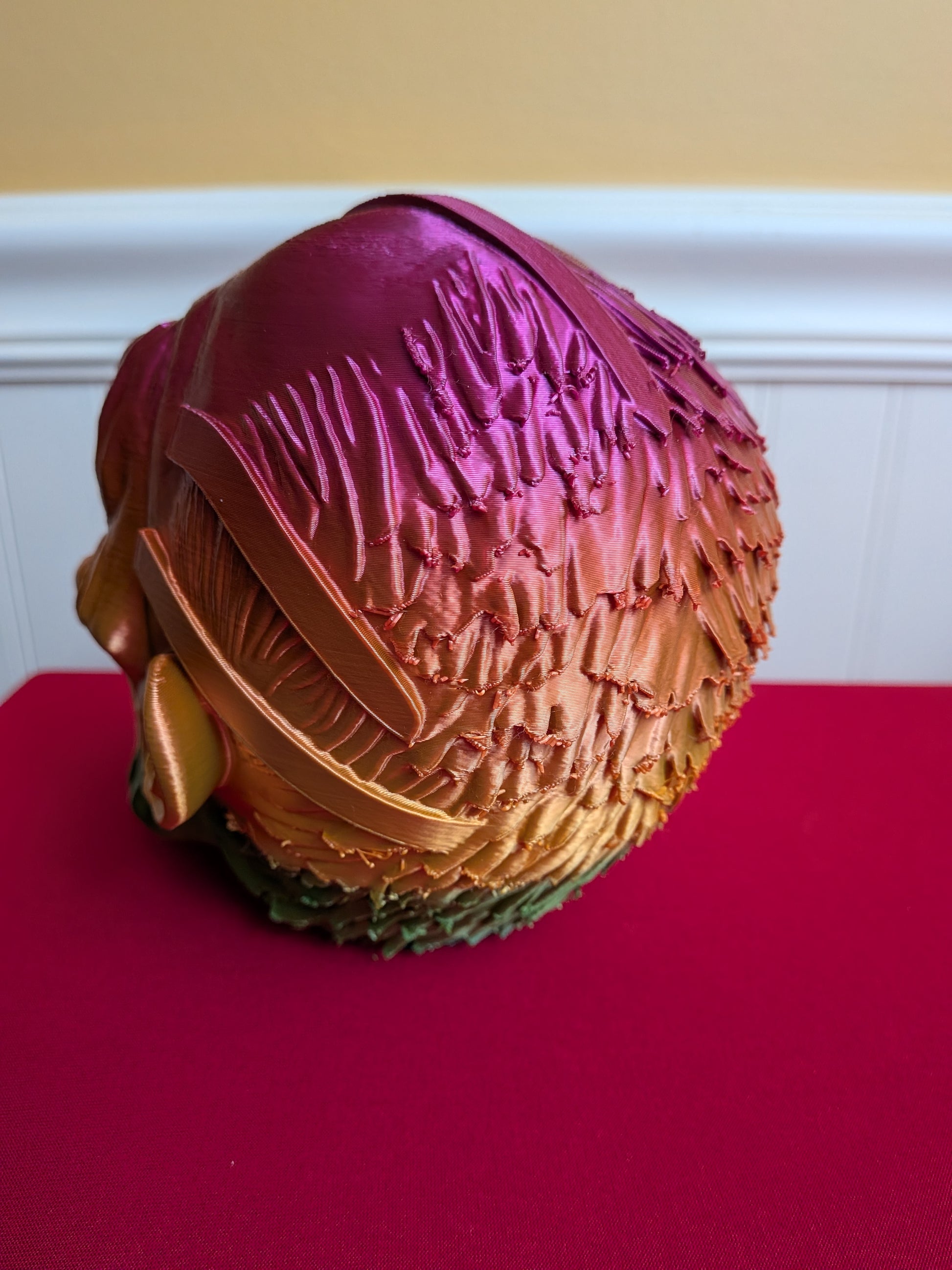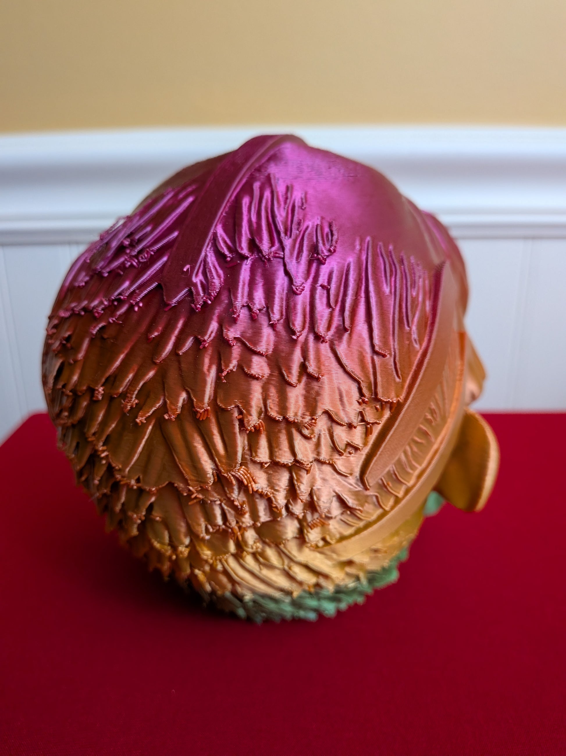 Designed and printed by us, this piece shows off incredible texture and depth, from the bone structure to every sinister curve of its grin. The multicolor gradient filament β shifting through vivid metallic pinks, oranges, and greens β gives it an otherworldly glow that changes with the light. Whether you display it on your shelf, studio, or desk, this head demands attention.