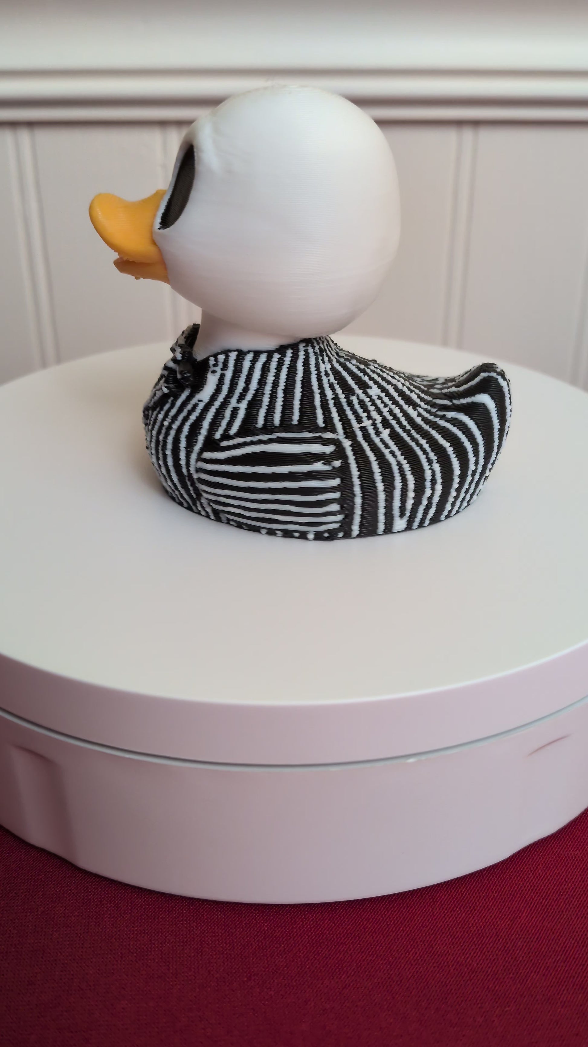 This Jack Duckington is 3D printed with high-quality PLA plastic — detailed, durable, and frightfully fun! He’s not rubber and won’t float, so let him haunt your shelves instead of your bathtub. PLA can handle temps up to 140°F, but avoid leaving him in hot spots — even the Pumpkin King can melt under too much sun.