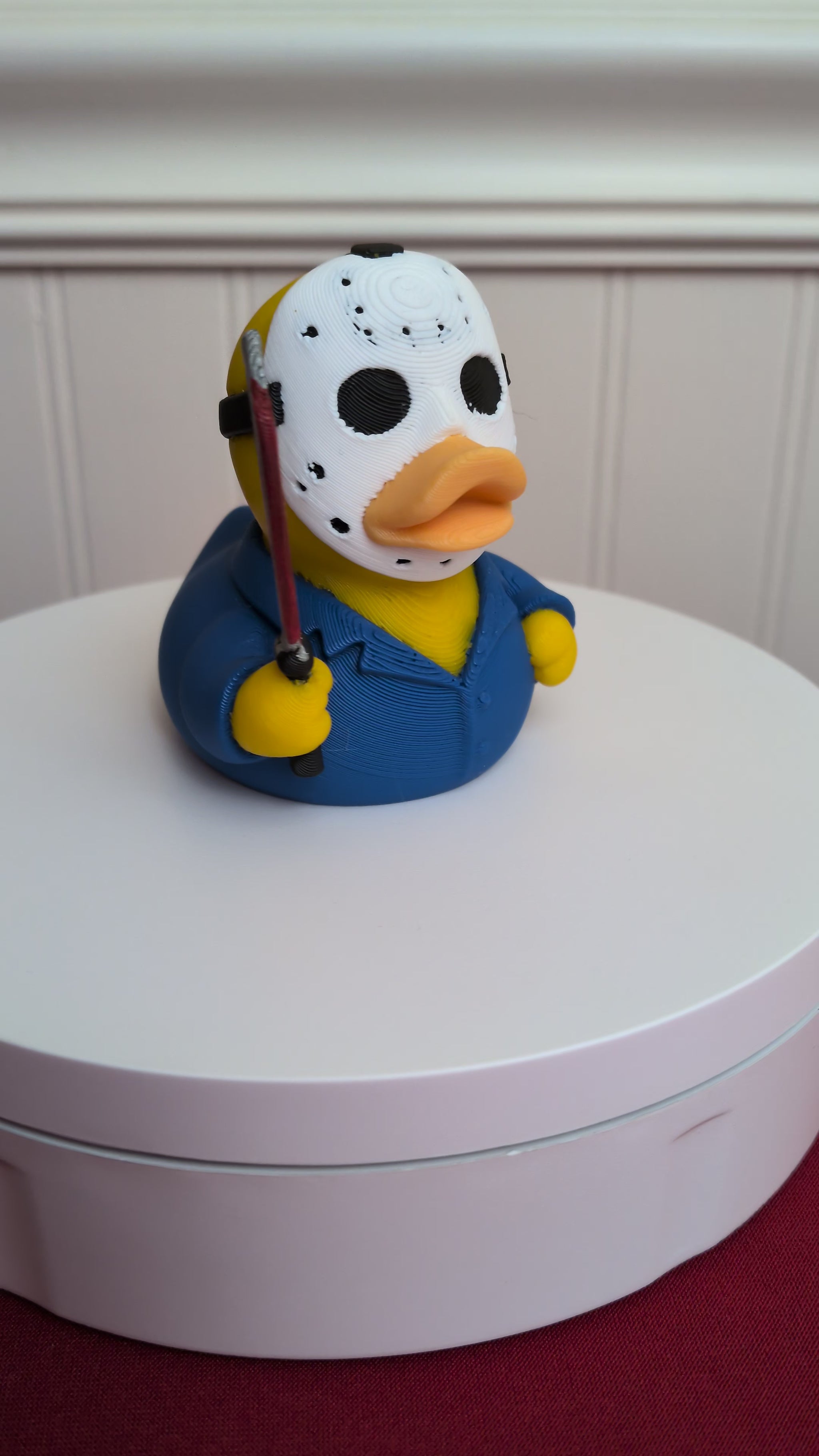 This Jason Duck is 3D printed with high-quality PLA plastic — sturdy, detailed, and spooky in all the right ways. He’s not rubber and won’t float, so keep him grounded where he can quietly watch… and maybe sneak up on other ducks. PLA can handle temps up to 140°F, but avoid hot spots unless you want your hockey-masked hunter to warp in real life.
