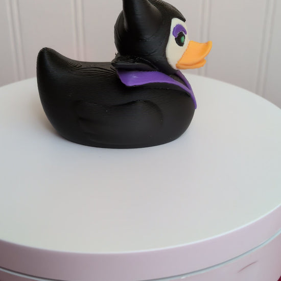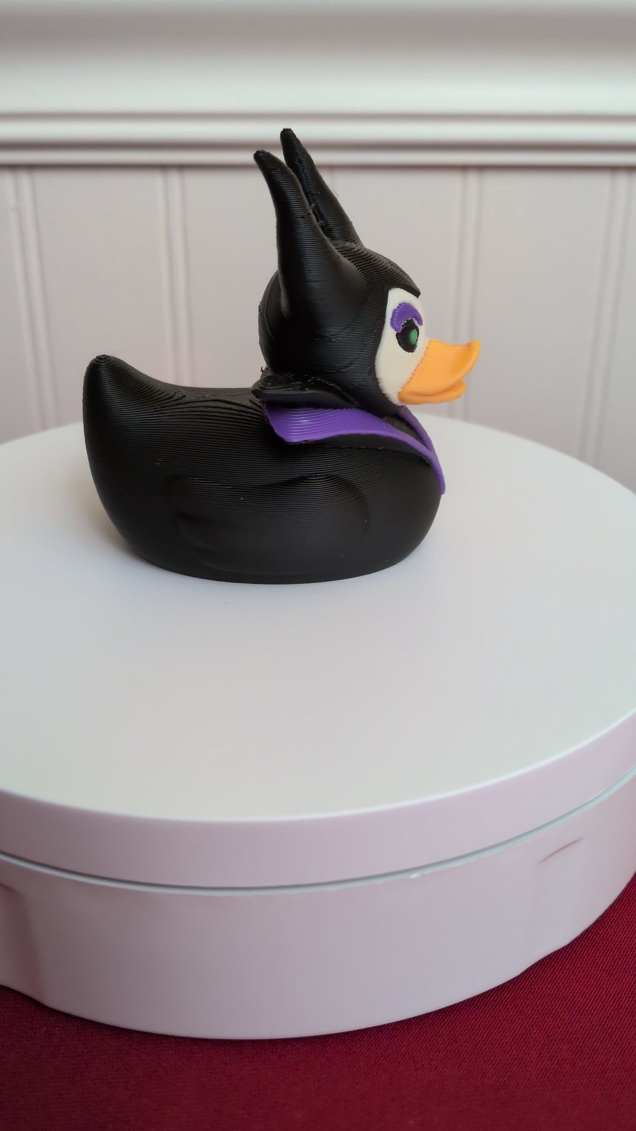 This Maleficent Duck is 3D printed with high-quality PLA plastic — sturdy, detailed, and full of villainous charm! She’s not rubber and won’t float, so keep her grounded where she can plot her magic. PLA can handle temps up to 140°F, but avoid leaving her in hot spots.