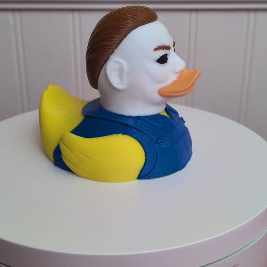This Michael Duck is 3D printed with high-quality PLA plastic — detailed, sturdy, and spooky-cute! He’s not rubber and won’t float, so let him stalk your shelves safely. PLA can handle temps up to 140°F, but avoid hot spots unless you want the ultimate “melting mask” effect.