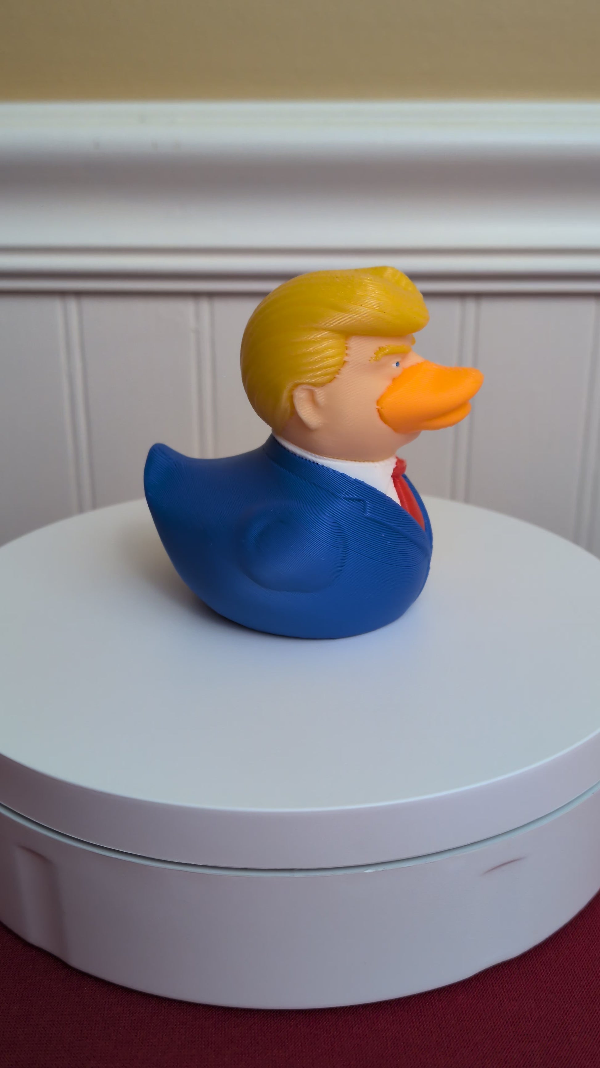 This Trump Duck is 3D printed with high-quality PLA plastic — durable, detailed, and full of personality! He’s not rubber and won’t float, so keep him grounded where he can rule the roost. PLA can handle temps up to 140°F, but avoid extreme heat.